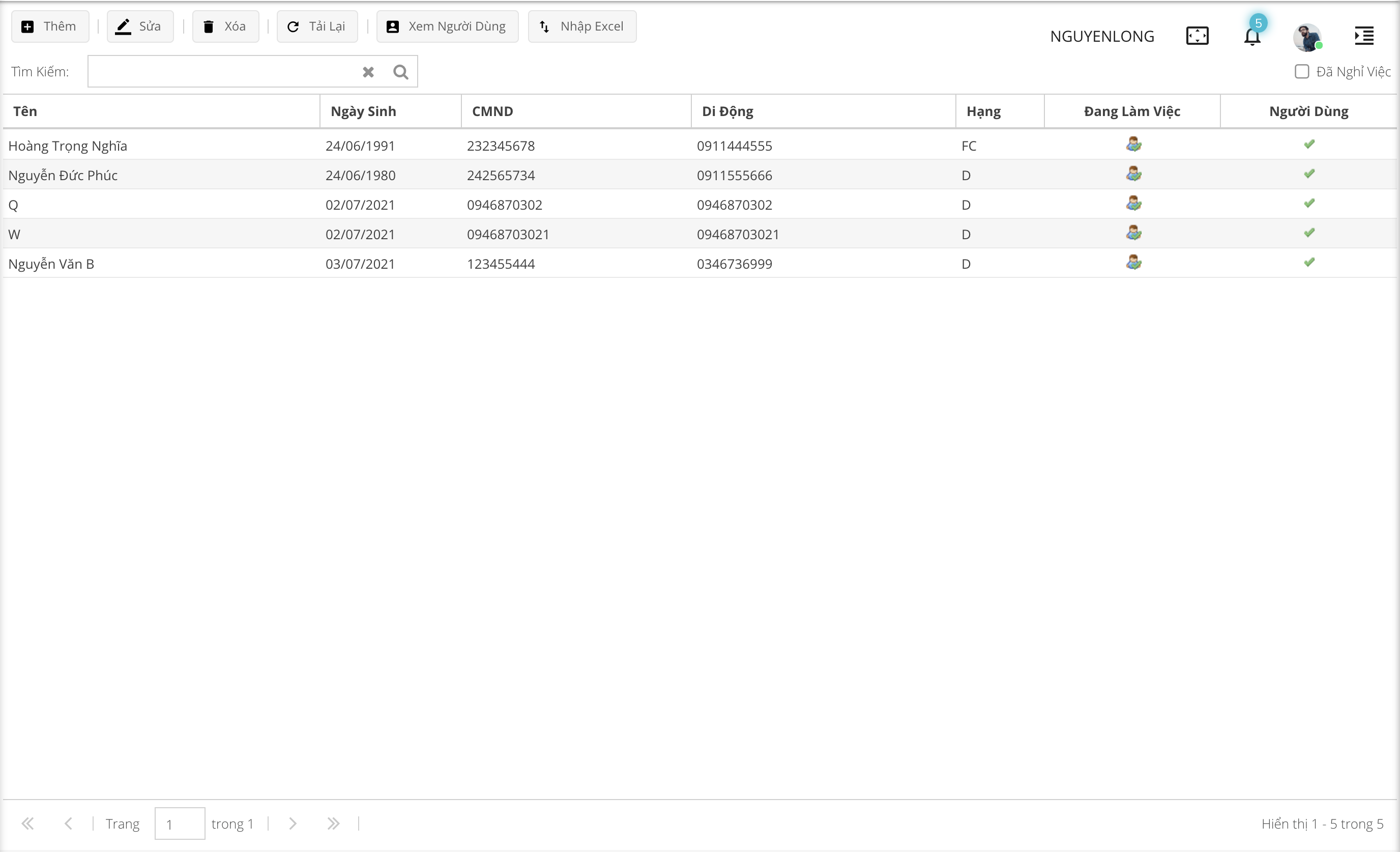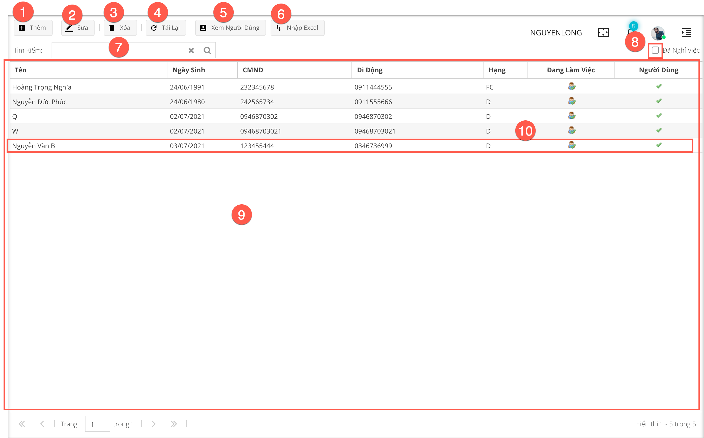 - (8): Nút Đã nghỉ việc - Lọc các tài xế có trạng thái đã nghỉ việc