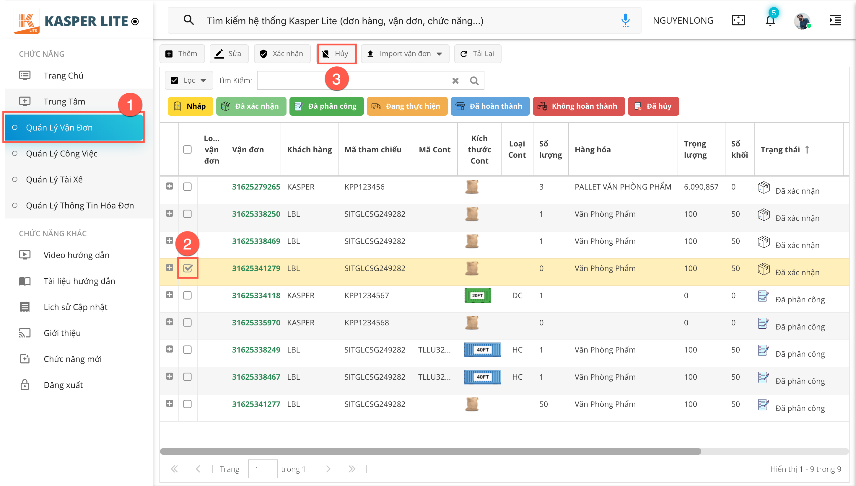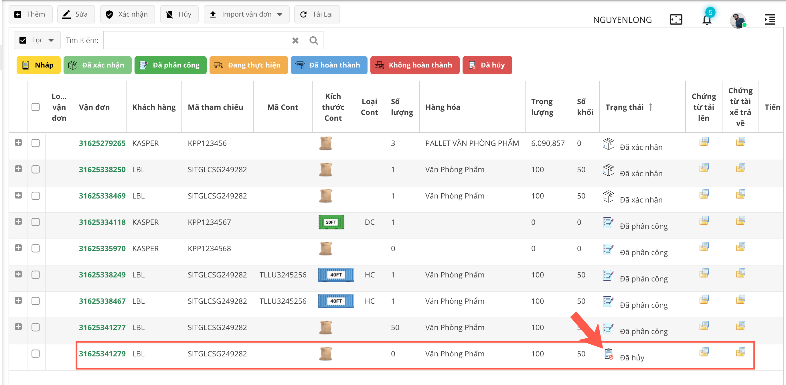 Kết quả: Vận đơn vừa thao tác chuyển sang Trạng thái Huỷ