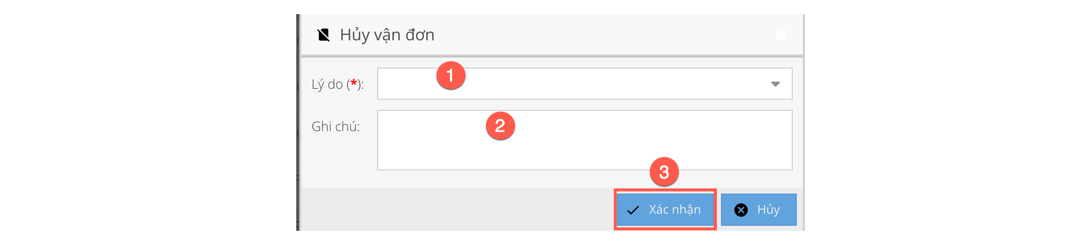 Thao tác Huỷ Vận đơn này áp dụng cho vận đơn ở tất cả các trạng thái. Thao tác này có yêu cầu người dùng nhập lý do.