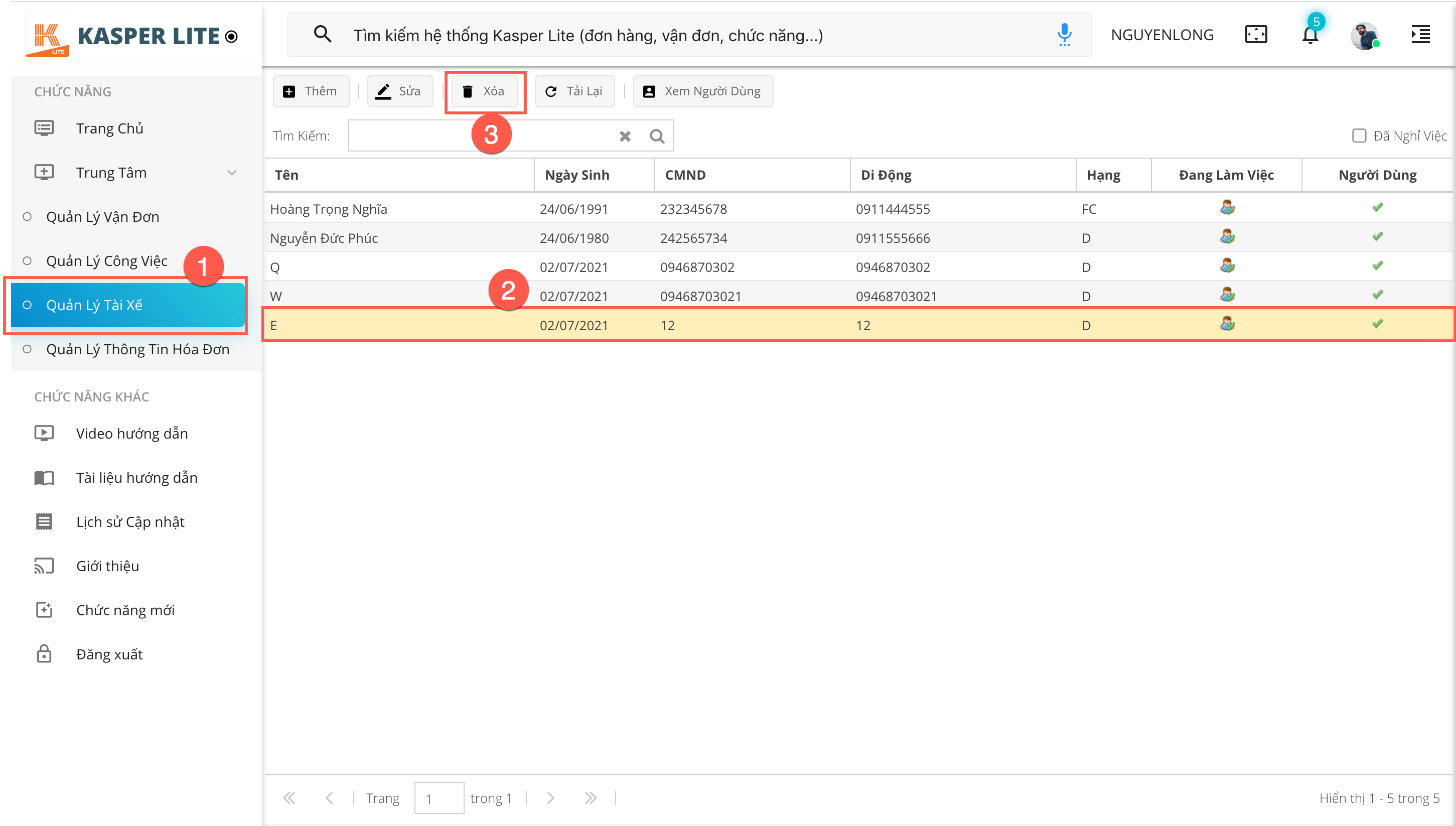 - (2): Bấm vào dòng thông tin của tài xế cần thao tác, sau đó bấm nút Xoá ở ô số (3).