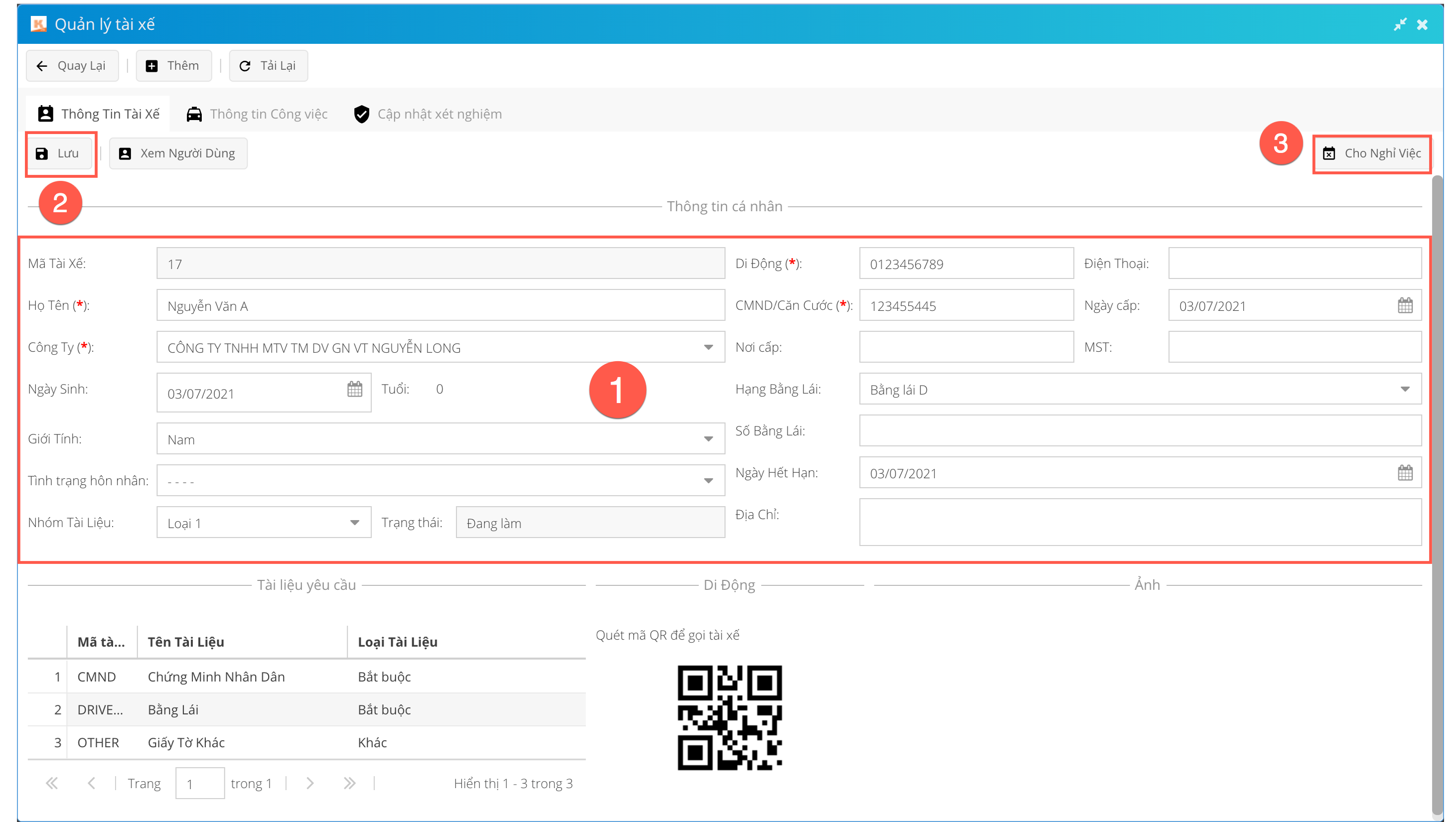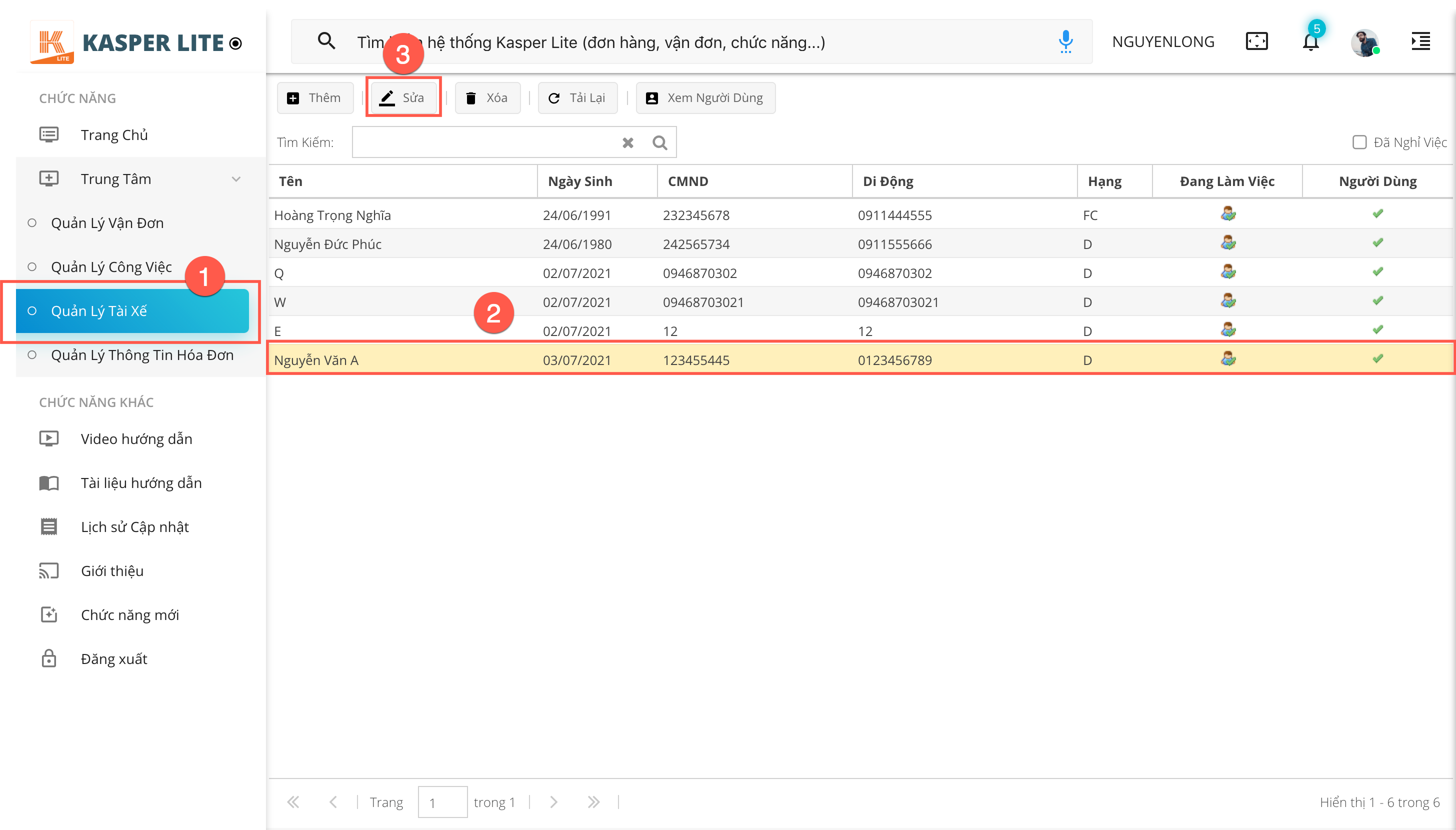- (2): Bấm vào dòng thông tin của tài xế cần thao tác, sau đó bấm nút Sửa ở ô số (3). Hoặc người dùng có thể nháy đúp chuột trái ở dòng thông tin của tài xế cần thao tác.