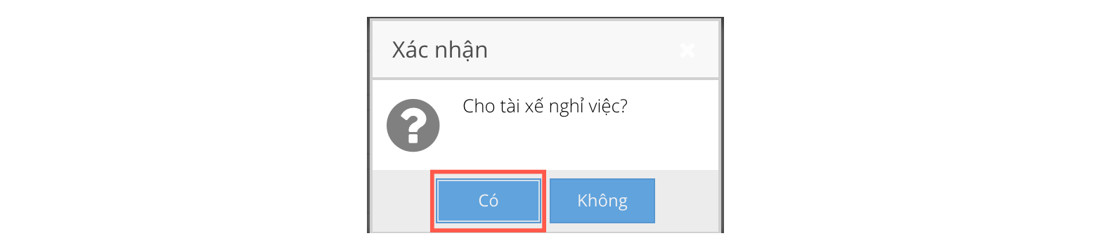 Trường hợp cho tài xế nghỉ việc, bấm nút Cho nghỉ việc ở ô số (3), hệ thống hiển thị cửa sổ yêu cầu người dùng xác nhận thao tác: