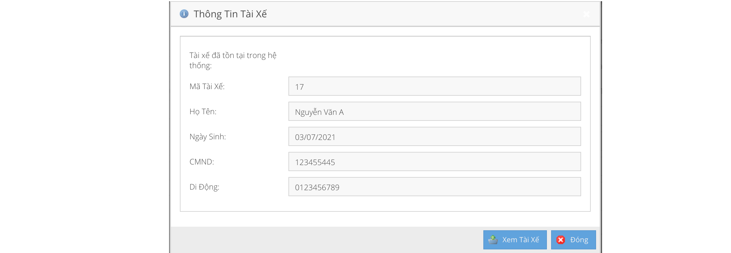 Ở những trường thông tin bắt buộc nhập (có dấu *), nếu người dùng nhập trùng với thông tin khác đã có trong hệ thống. Lúc này hệ thống sẽ tự động cảnh báo Tài xế đã tồn tại trong hệ thống