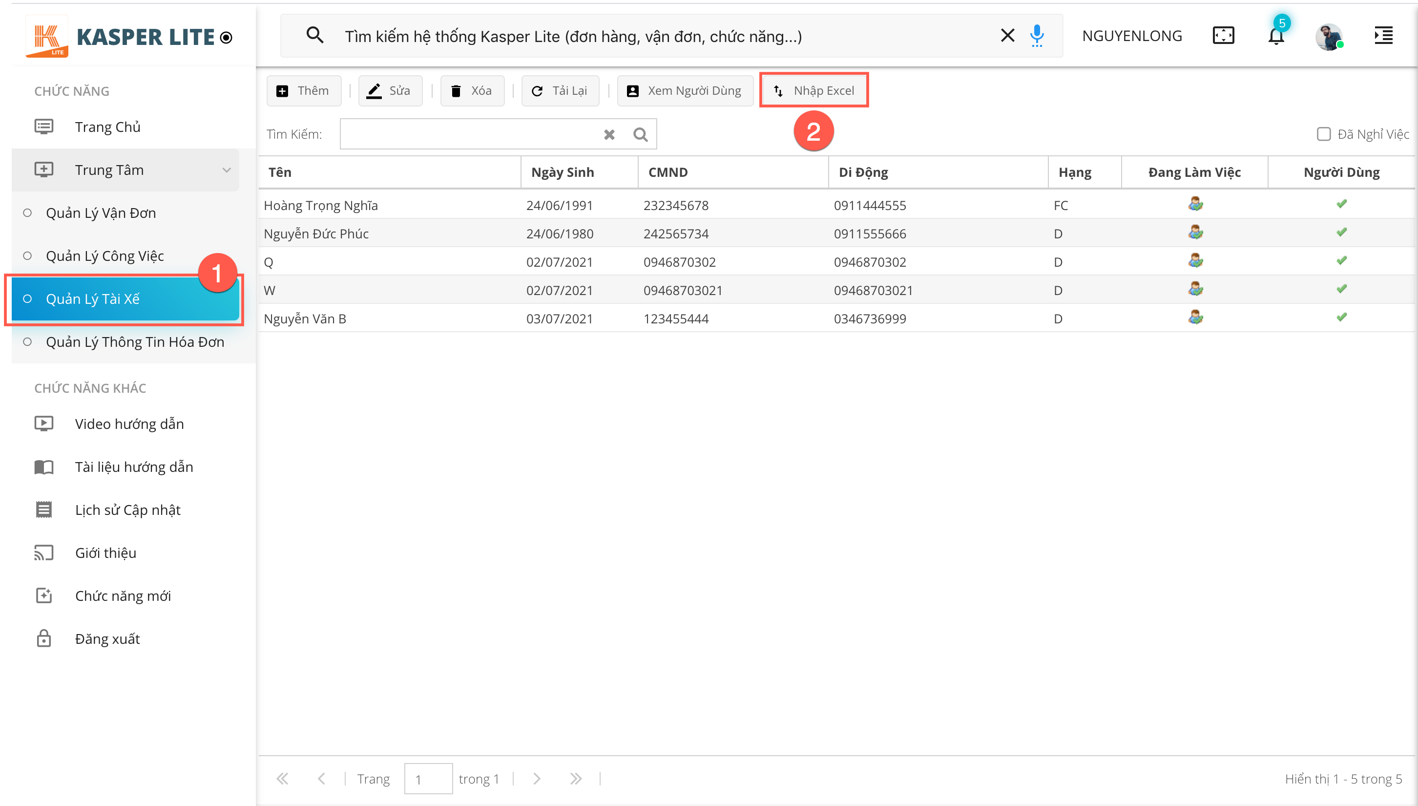 - (2): Bấm nút Nhập Excel để thêm tài xế mới bằng các tải lên file excel