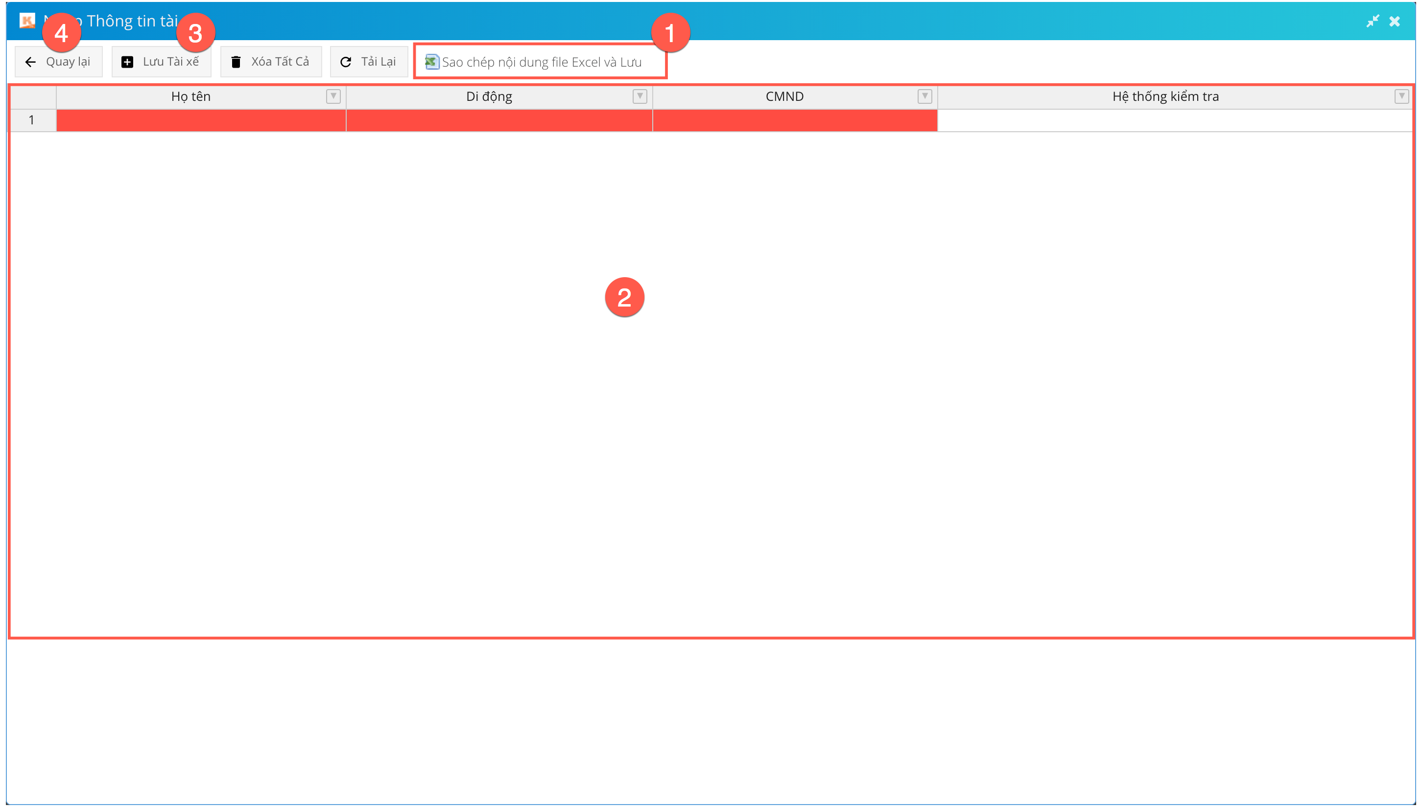 - (1): Bấm nút Sao chép nội dung file excel và lưu để tải lên các thông tin tài xế mới, file excel tải lên đáp ứng đủ 3 trường thông tin theo tứ tự các cột từ trái sang phải: Họ tên, Di động, CMND