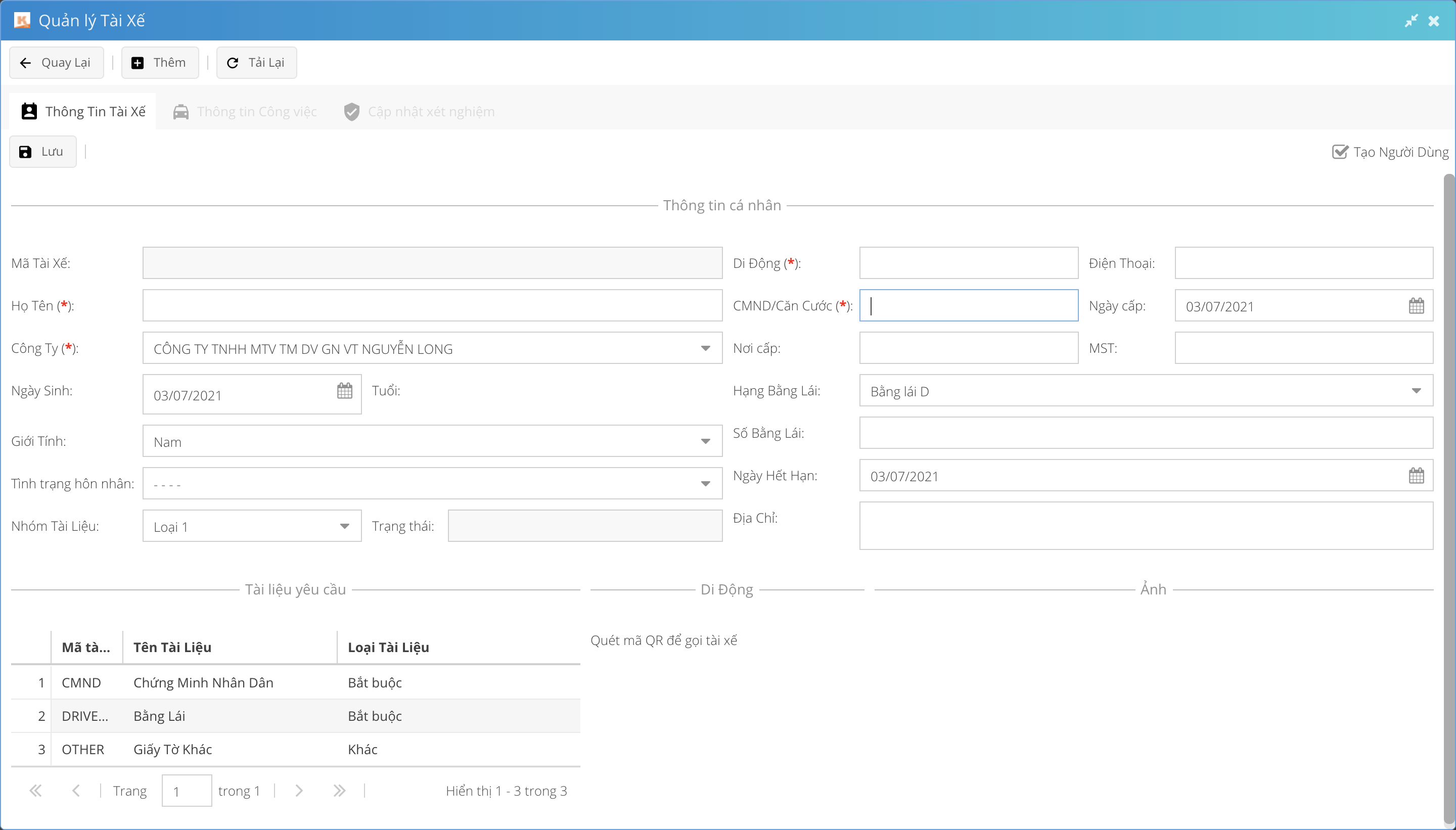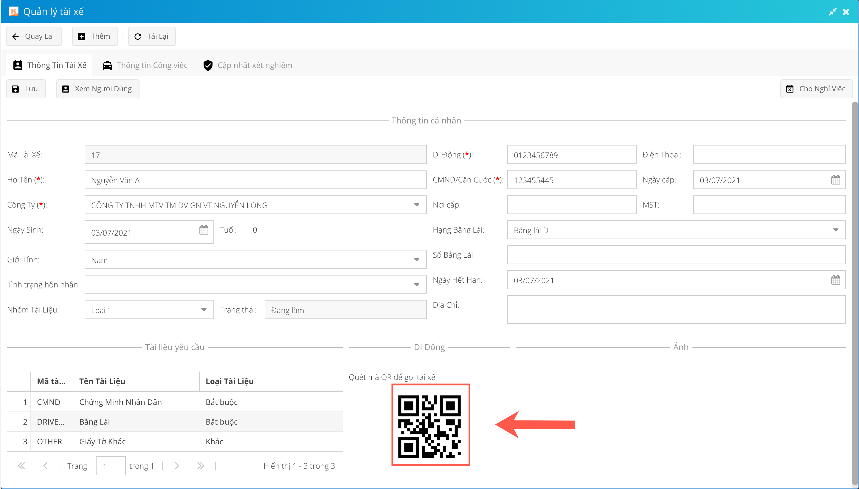 Thực hiện nháy đúp chuột trái ở dòng thông tin của tài xế để xem chi tiết, hệ thống có cập nhật tự động QR code số điện thoại để dể dàng liên hệ cho tài xế nếu cần: