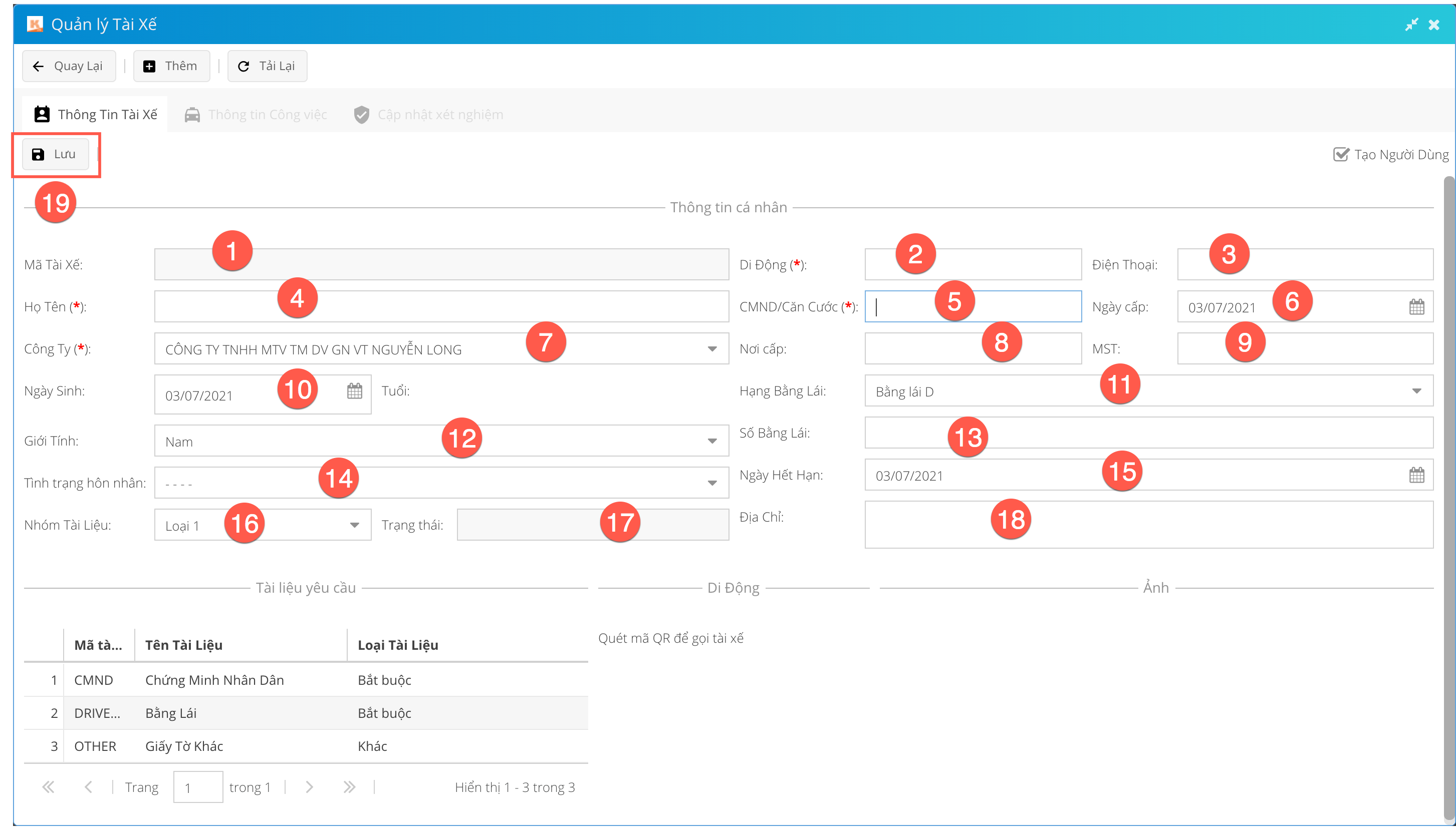 - (19): Bấm nút Lưu để lưu các thông tin vừa nhập liệu