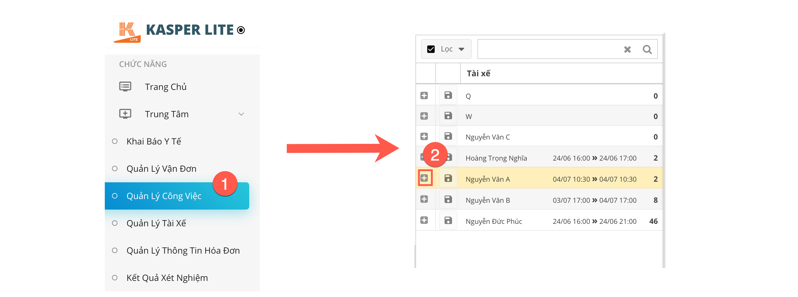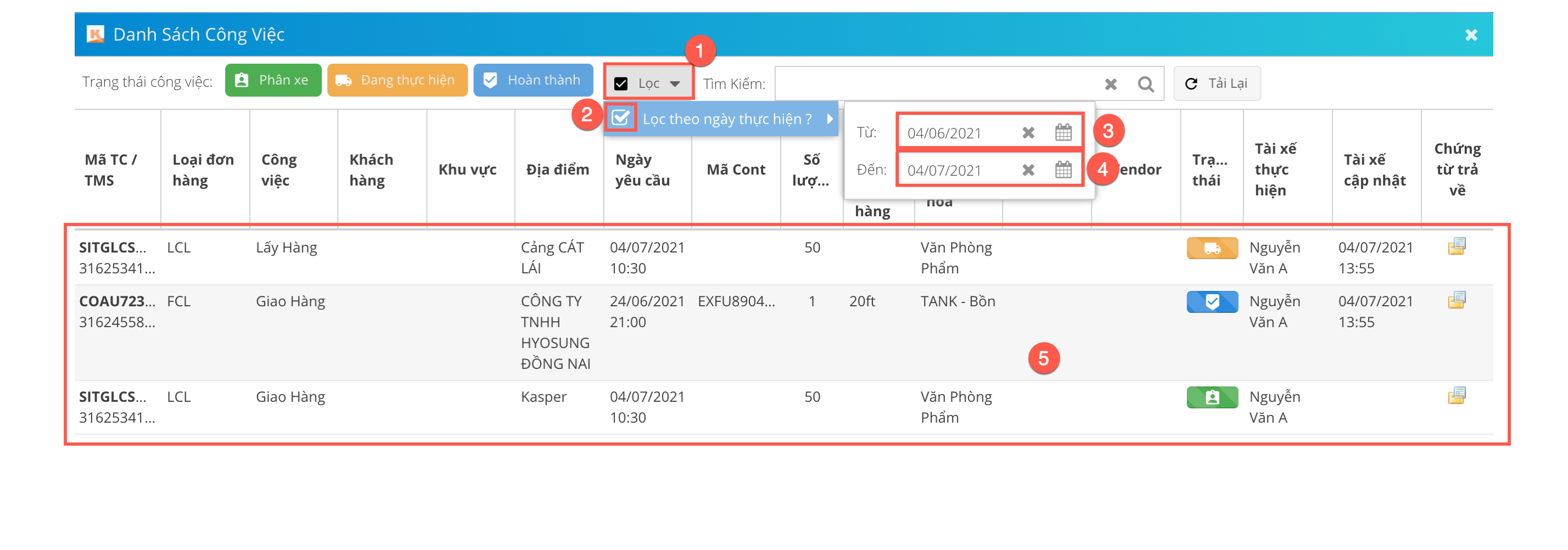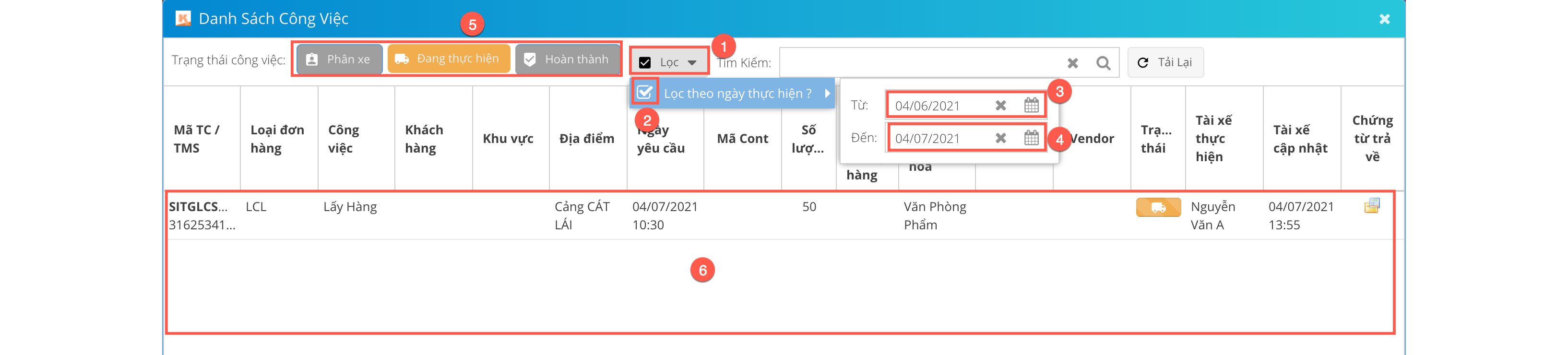 - (1): Ở Cửa sổ danh sách công việc của tài xế, bấm nút Lọc