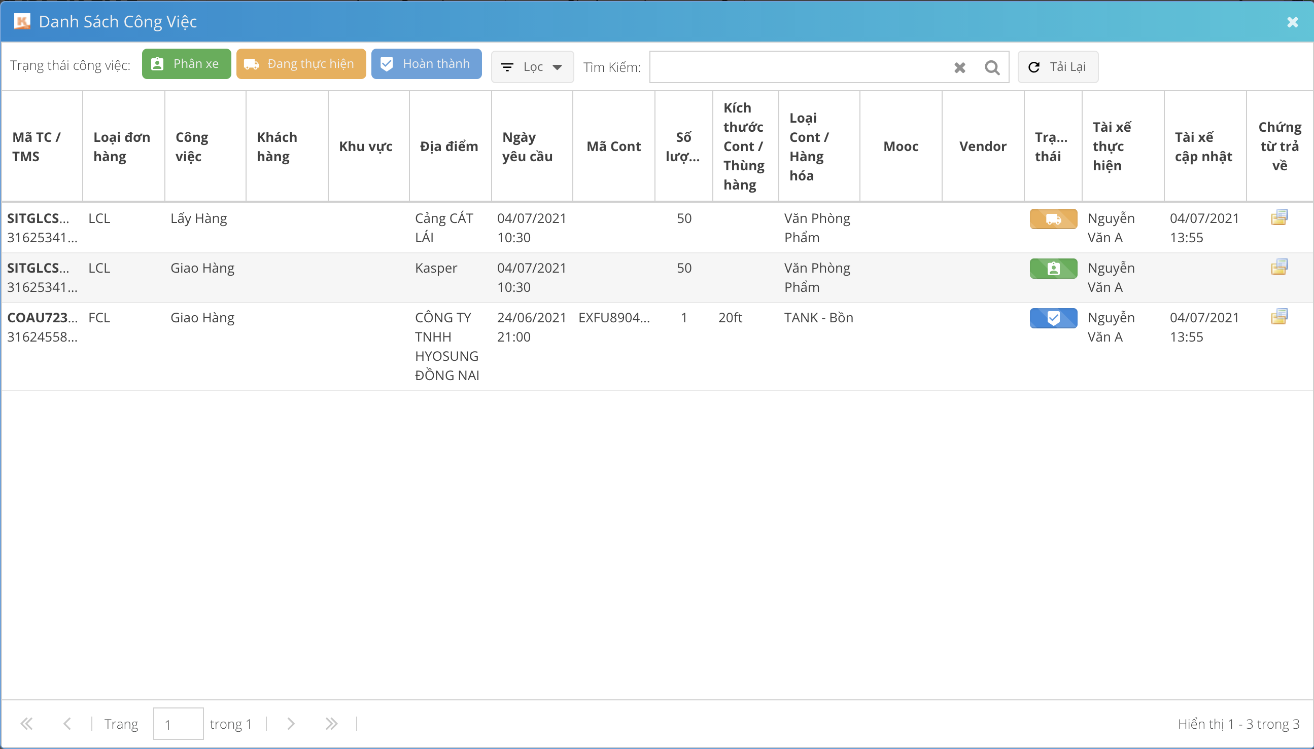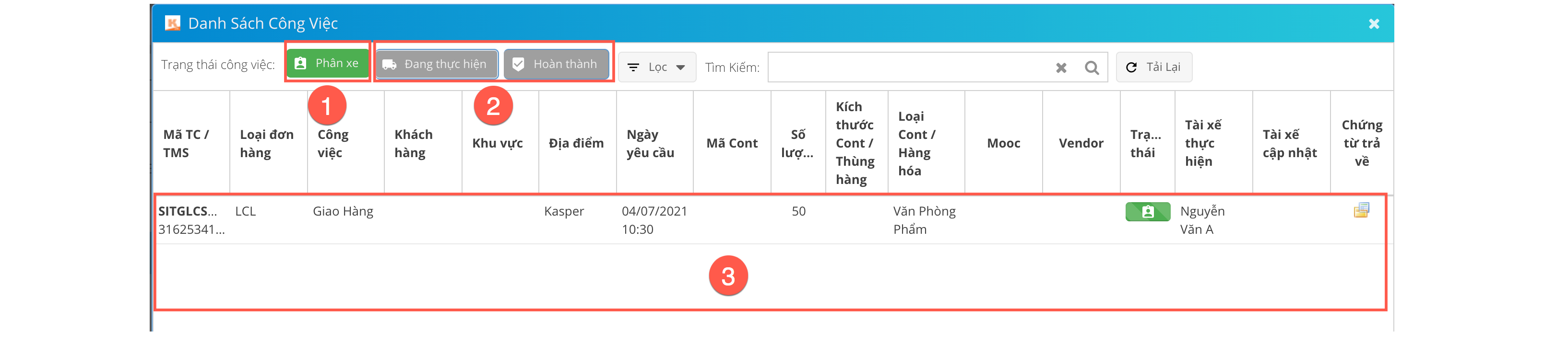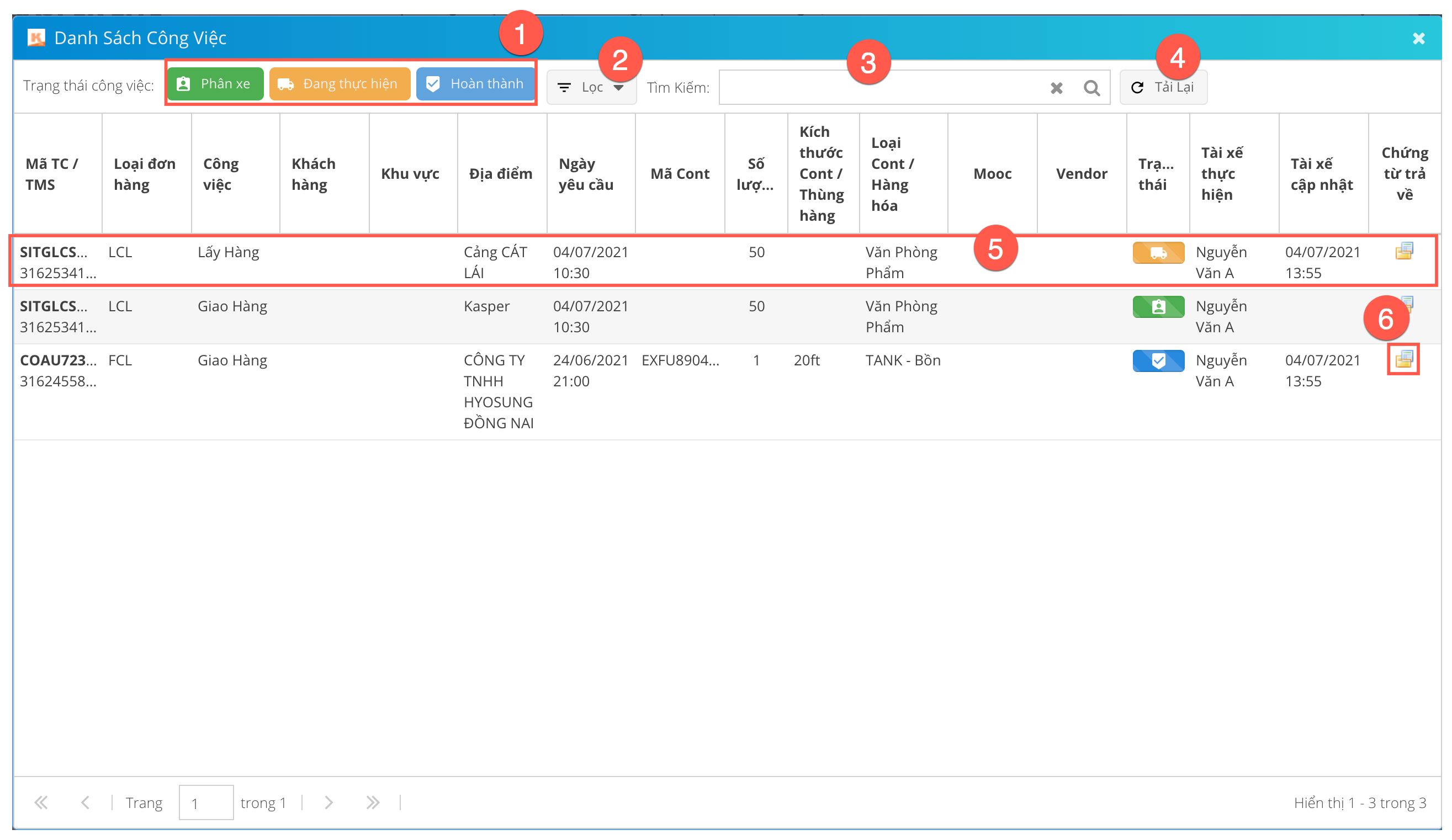 - (5): Dòng thông tin của một công việc, bao gồm: mã TC/TMS của công việc, Loại đơn hàng (FCL hoặc LCL), Loại công việc, Khách hàng, Khu vực, Địa điểm thực hiện công việc, Ngày yêu cầu của công việc, Mã cont, Số lượng, Kích thước cont/thùng hàng, Loại cont/thùng hàng, Mooc, Vendor, Trạng thái của công việc, Tài xế thực hiện và các chứng từ tài xế trả về