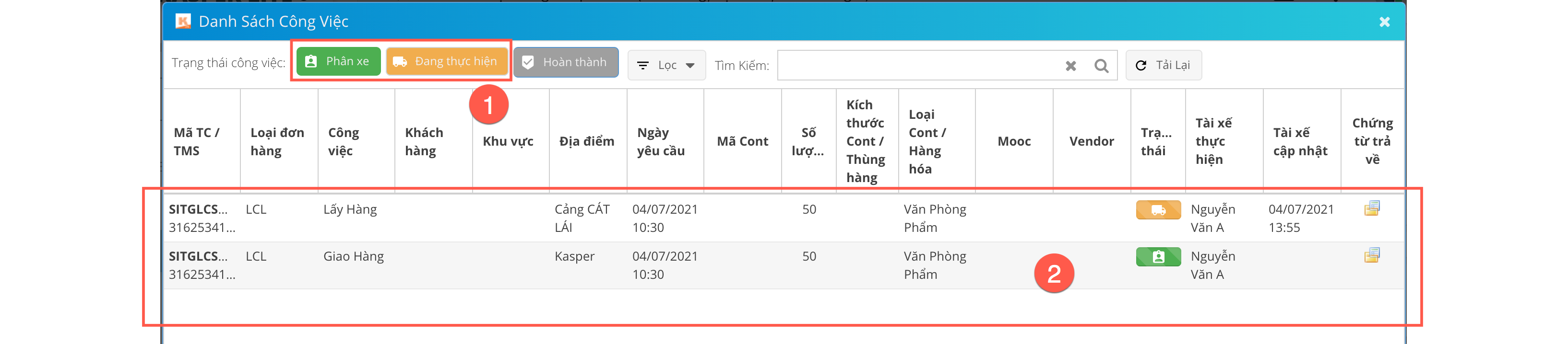 - (1): Ở Cửa sổ danh sách công việc của tài xế, giữ lại Trạng thái của công việc cần lọc